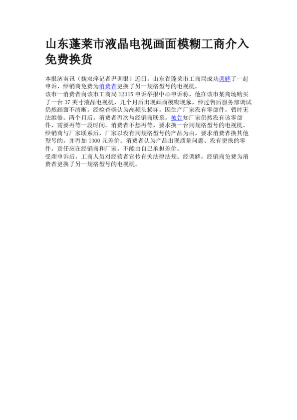 山東蓬萊市液晶電視畫面模糊工商介入免費換貨