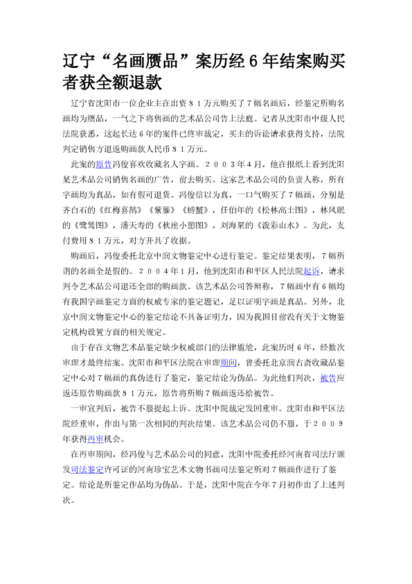 遼寧“名畫贗品”案歷經(jīng)6年結(jié)案購買者獲全額退款