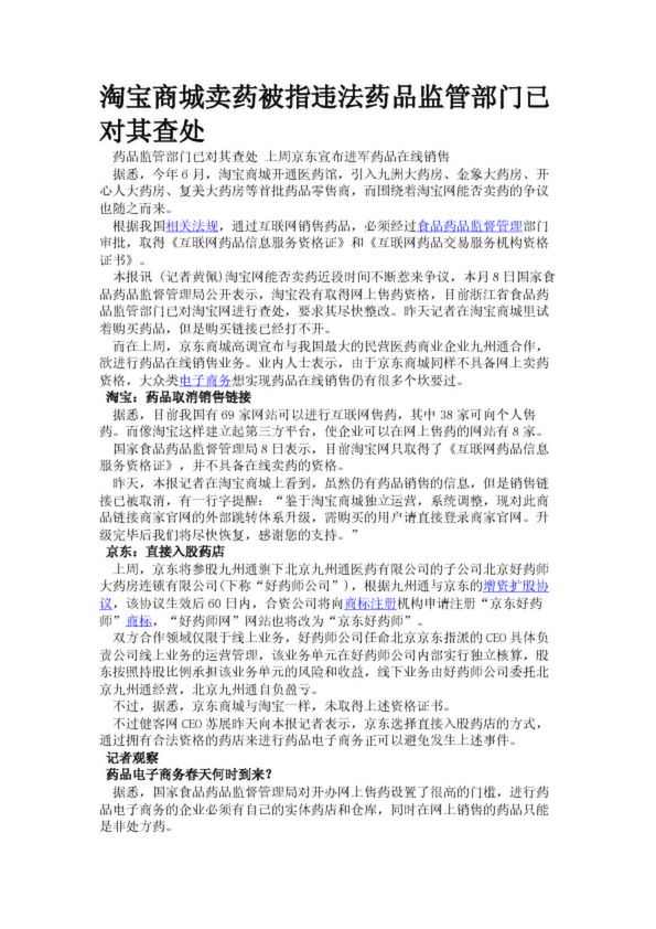 淘寶商城賣藥被指違法藥品監(jiān)管部門已對(duì)其查處(25.38KB)
