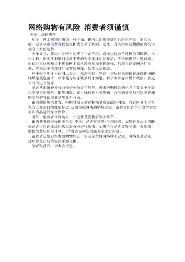 網(wǎng)絡(luò)購(gòu)物有風(fēng)險(xiǎn) 消費(fèi)者須謹(jǐn)慎(18.80KB)