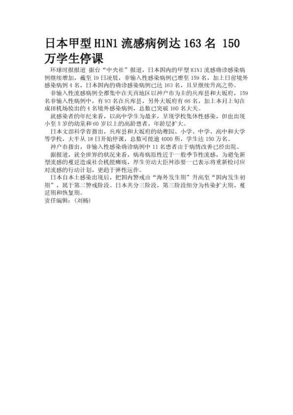 日本甲型H1N1流感病例達(dá)163名 150萬(wàn)學(xué)生停課(17.79KB)