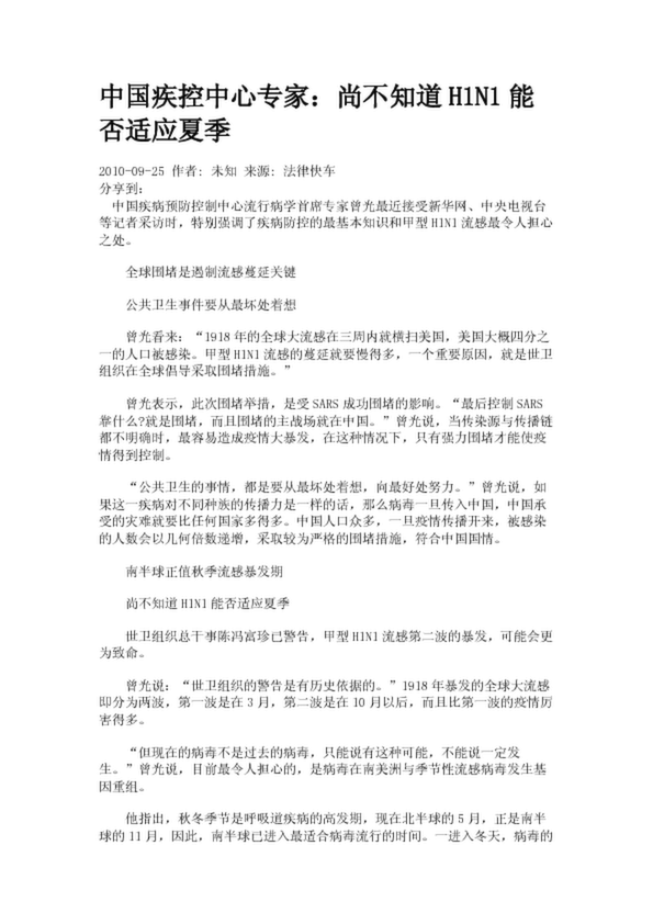中國疾控中心專家:尚不知道H1N1能否適應夏季