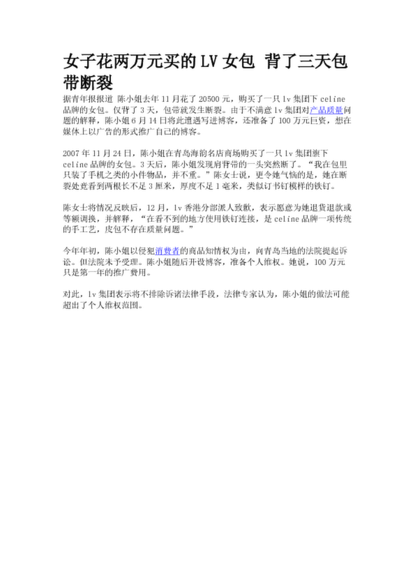 女子花兩萬(wàn)元買(mǎi)的LV女包 背了三天包帶斷裂