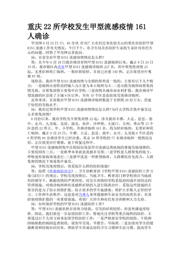 重慶22所學校發(fā)生甲型流感疫情161人確診