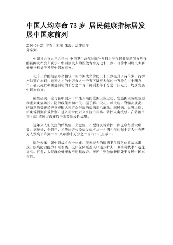中國人均壽命73歲 居民健康指標(biāo)居發(fā)展中國家前列
