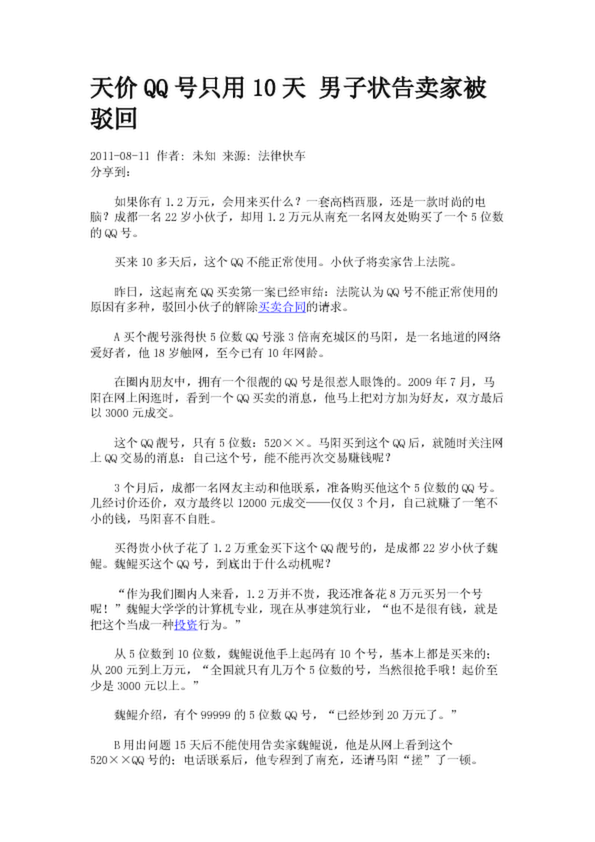 天價(jià)QQ號(hào)只用10天 男子狀告賣家被駁回(6.38KB)