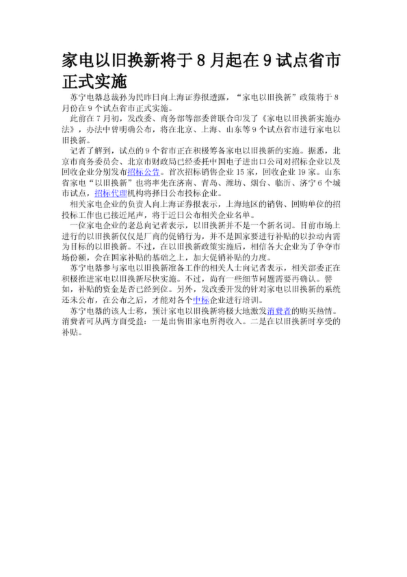 家電以舊換新將于8月起在9試點省市正式實施