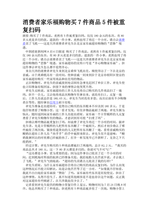 消費(fèi)者家樂福購物買7件商品5件被重復(fù)掃碼