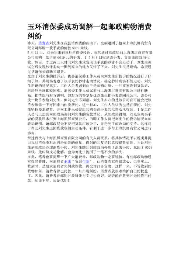 玉環(huán)消保委成功調解一起郵政購物消費糾紛
