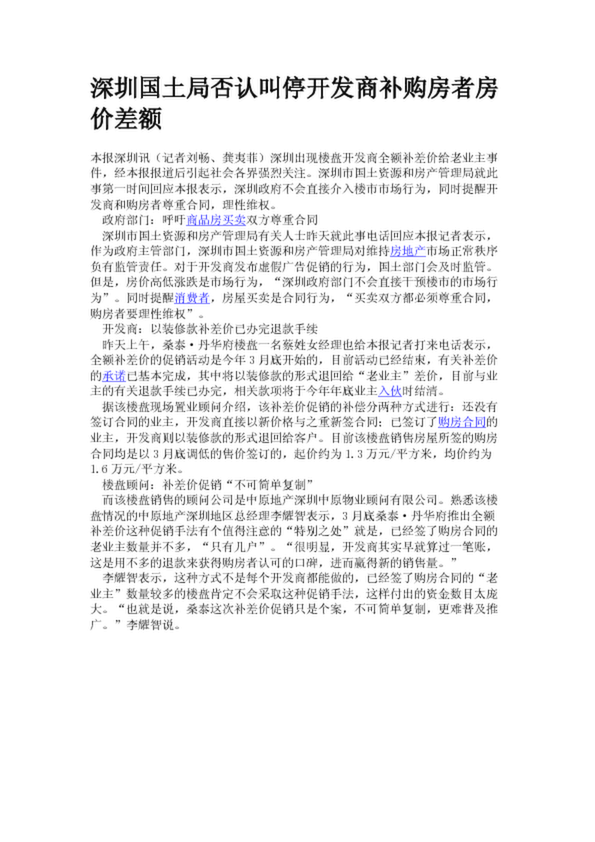 深圳國土局否認(rèn)叫停開發(fā)商補購房者房價差額
