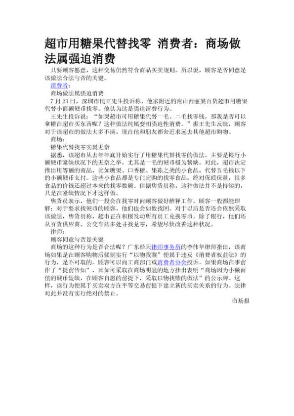 超市用糖果代替找零 消費(fèi)者:商場做法屬強(qiáng)迫消費(fèi)