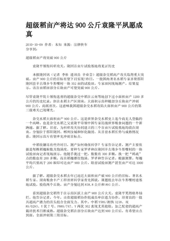 超級稻畝產(chǎn)將達900公斤袁隆平夙愿成真