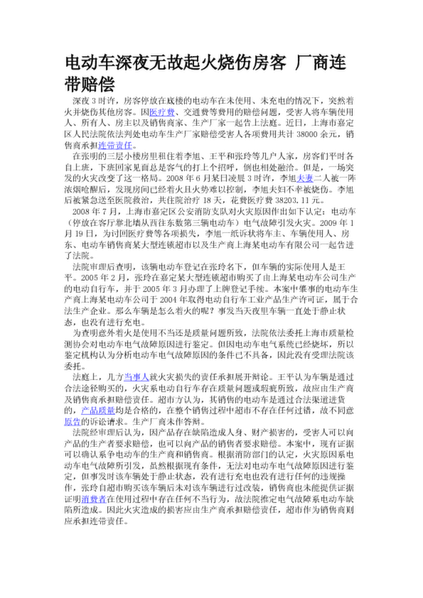 電動車深夜無故起火燒傷房客 廠商連帶賠償