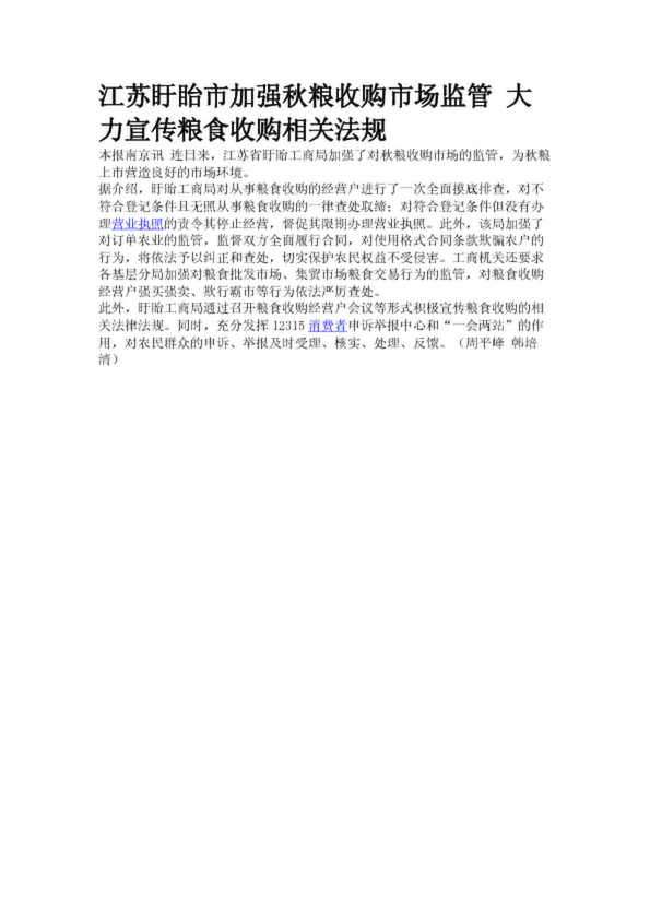 江蘇盱眙市加強秋糧收購市場監(jiān)管 大力宣傳糧食收購相關法規(guī)