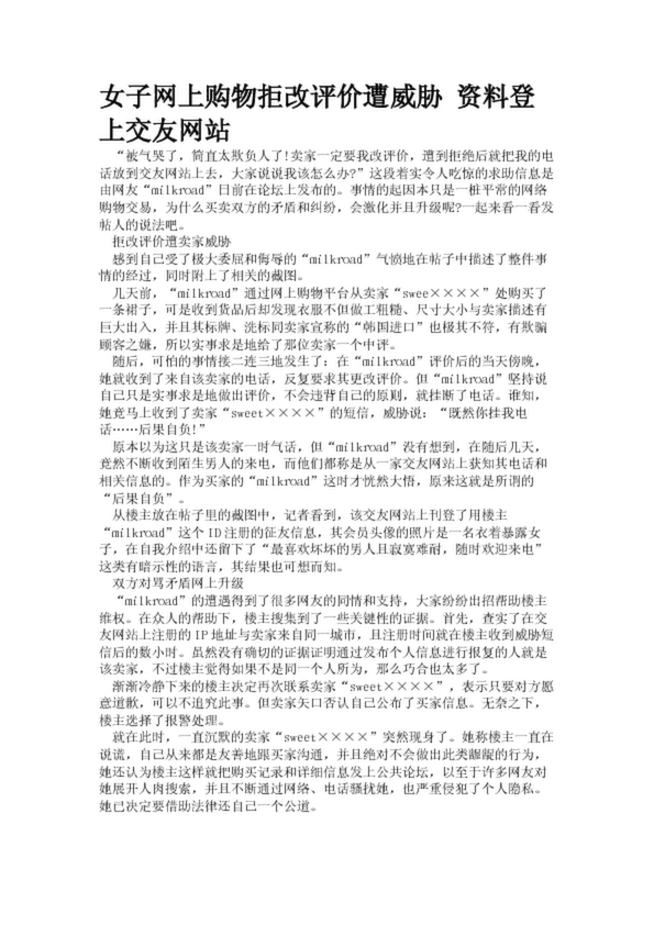 女子網(wǎng)上購物拒改評價遭威脅 資料登上交友網(wǎng)站