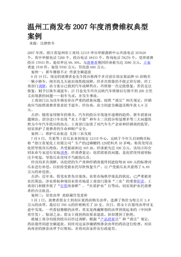 溫州工商發(fā)布2007年度消費維權(quán)典型案例
