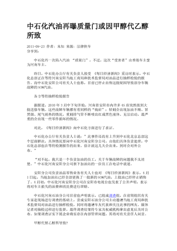 中石化汽油再曝質(zhì)量門或因甲醇代乙醇所致