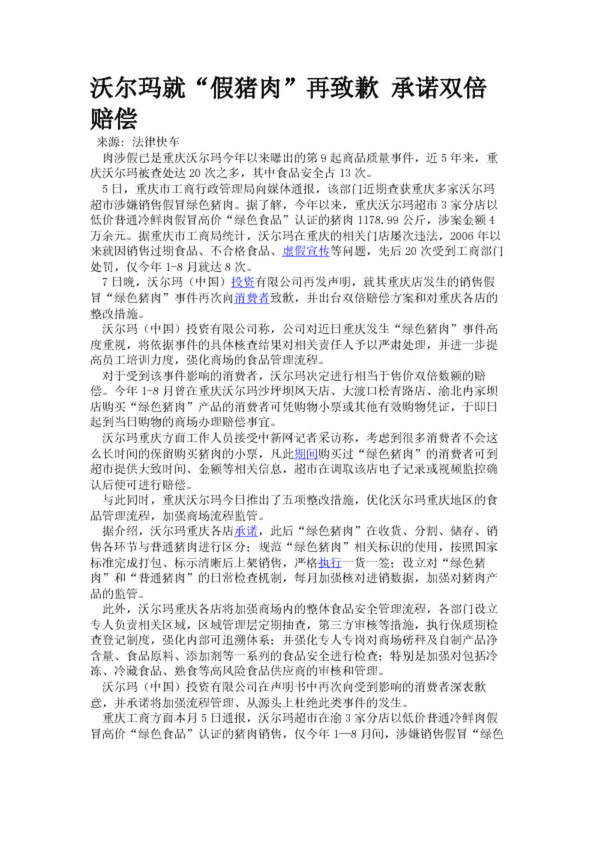 沃爾瑪就“假豬肉”再致歉 承諾雙倍賠償