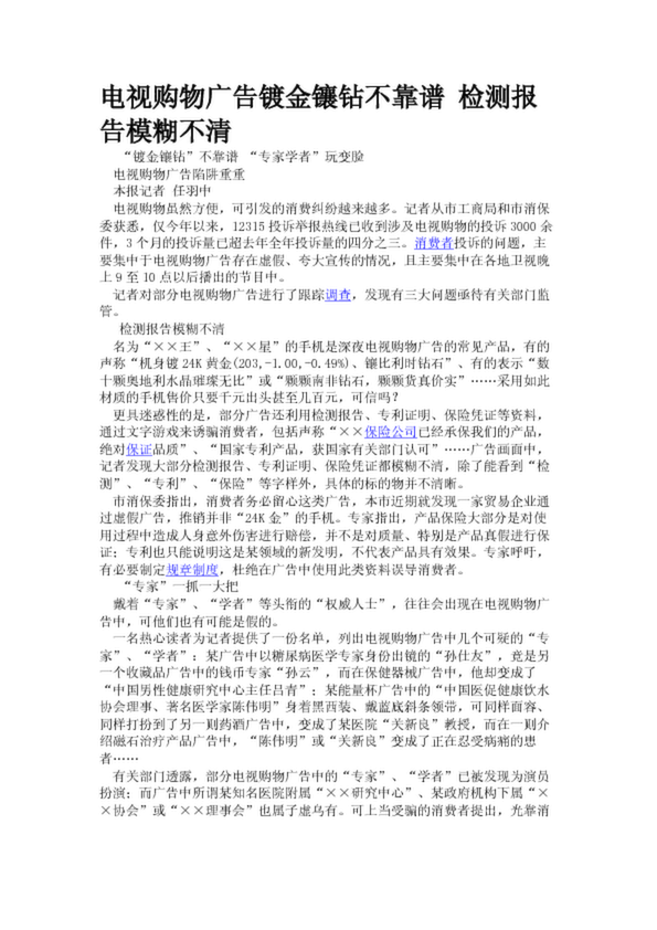 電視購(gòu)物廣告鍍金鑲鉆不靠譜 檢測(cè)報(bào)告模糊不清(24.10KB)