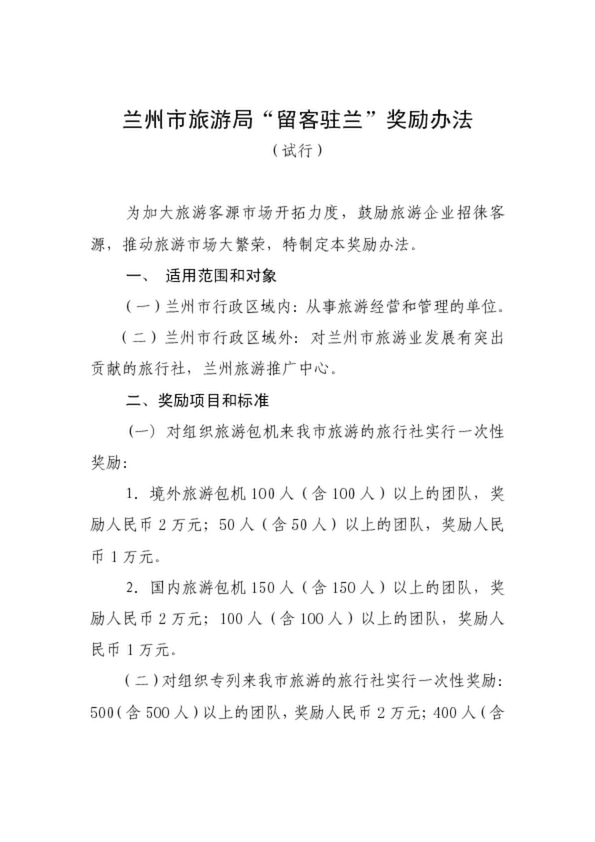 蘭州市旅游局“留客駐蘭”獎勵辦法