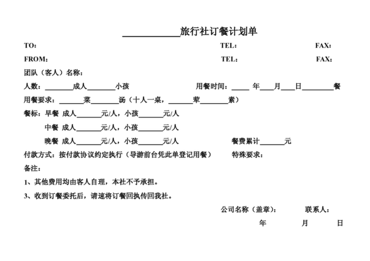 旅行社計(jì)調(diào)-訂餐計(jì)劃單