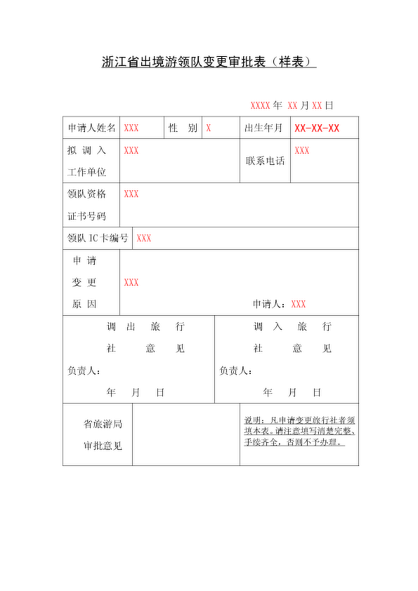 浙江省出境游領(lǐng)隊變更審批表(樣表)