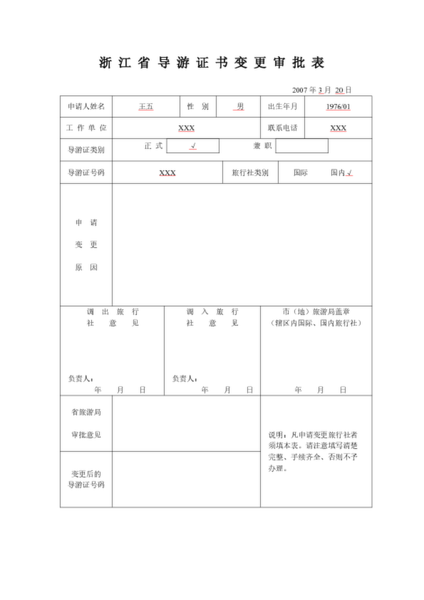 浙江省導(dǎo)游證書變更審批表(樣表)
