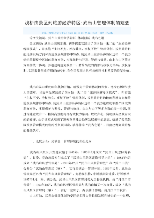 淺析由景區(qū)到旅游經濟特區(qū)武當山管理體制的嬗變