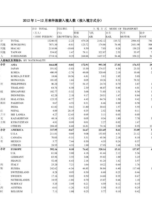 1-12月來華旅游入境人數(shù)(按入境方式分)