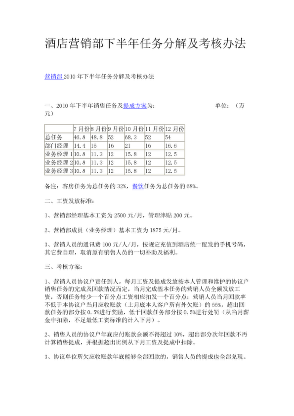 營銷業(yè)績完成與否,營銷總監(jiān)和部門經(jīng)理參照酒店 2011 年經(jīng)營績效考核責任書規(guī)定執(zhí)行...經(jīng)理的考核 任務; 2、營銷部內(nèi)部實行任務分解不影響總?cè)蝿諗?shù)的完成和業(yè)績提成獎...