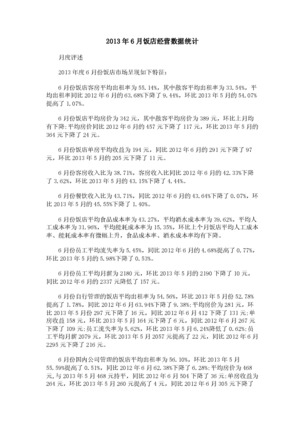 2013年6月飯店經(jīng)營(yíng)數(shù)據(jù)統(tǒng)計(jì)