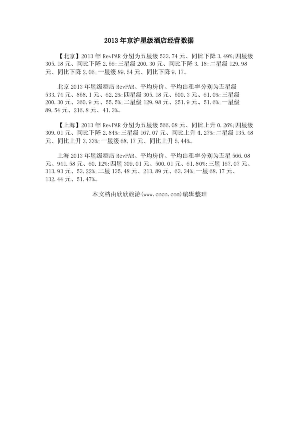 2013年京滬星級酒店經(jīng)營數(shù)據(jù)
