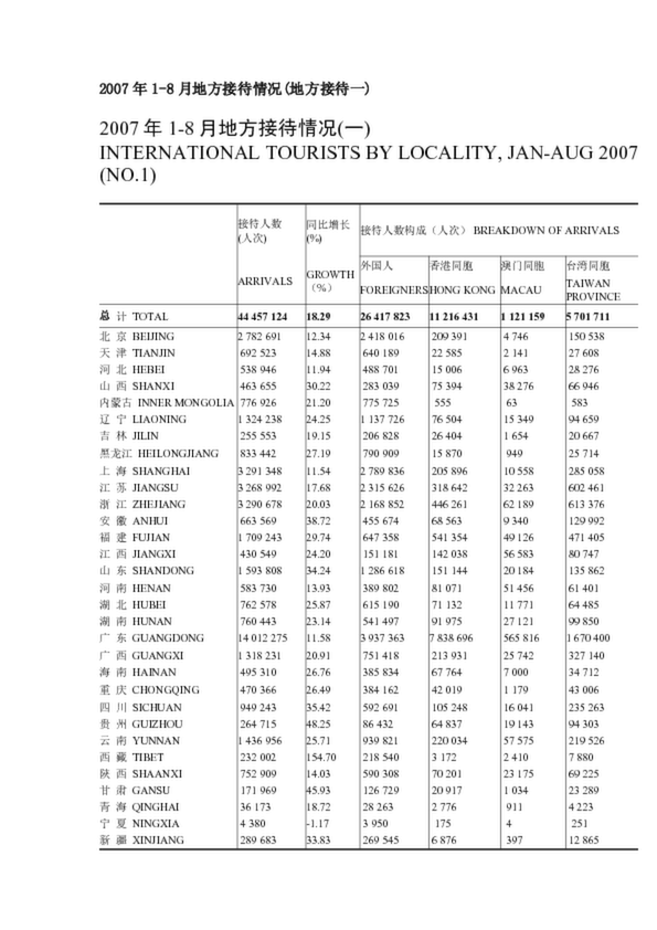 2007年1-8月地方接待情況(地方接待一)