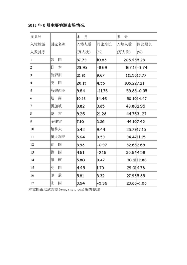2011年6月主要客源市場(chǎng)情況(37.03KB)