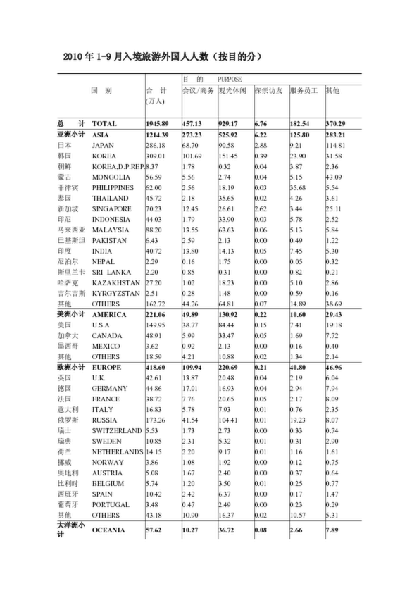 2010年1-9月入境旅游外國人人數(shù)(按目的分)