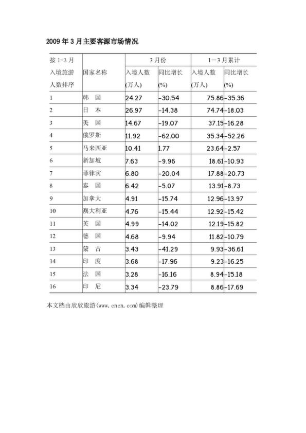 2009年3月主要客源市場情況