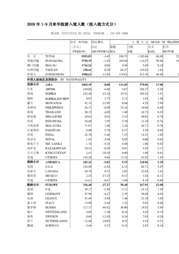 2009年1-9月來(lái)華旅游入境人數(shù)(按入境方式分)