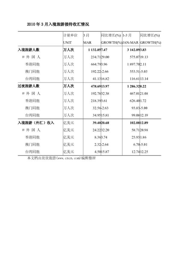 2010年3月入境旅游接待收匯情況