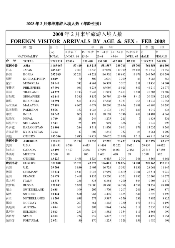 2008年2月來(lái)華旅游入境人數(shù)(年齡性別)