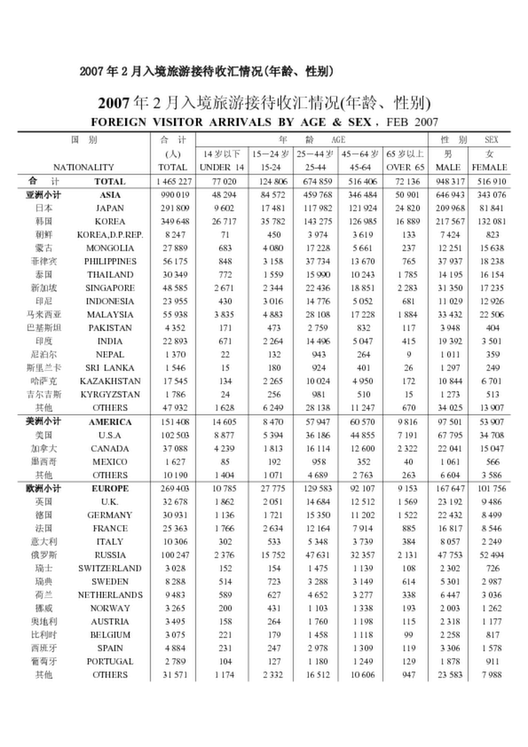 2007年2月入境旅游接待收匯情況(年齡、性別)