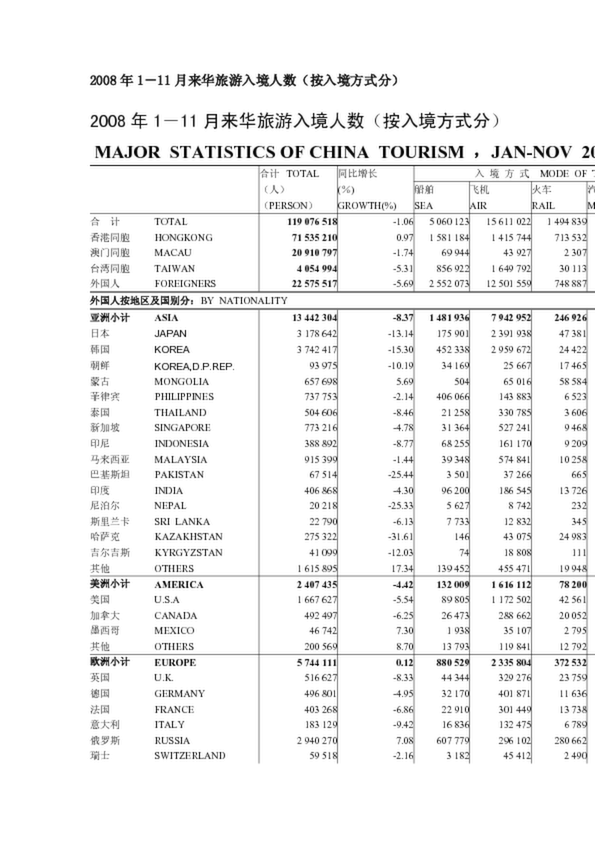 2008年1-11月來華旅游入境人數(shù)(按入境方式分)