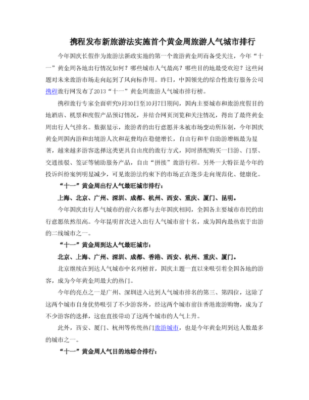 攜程發(fā)布新旅游法實施首個黃金周旅游人氣城市排行
